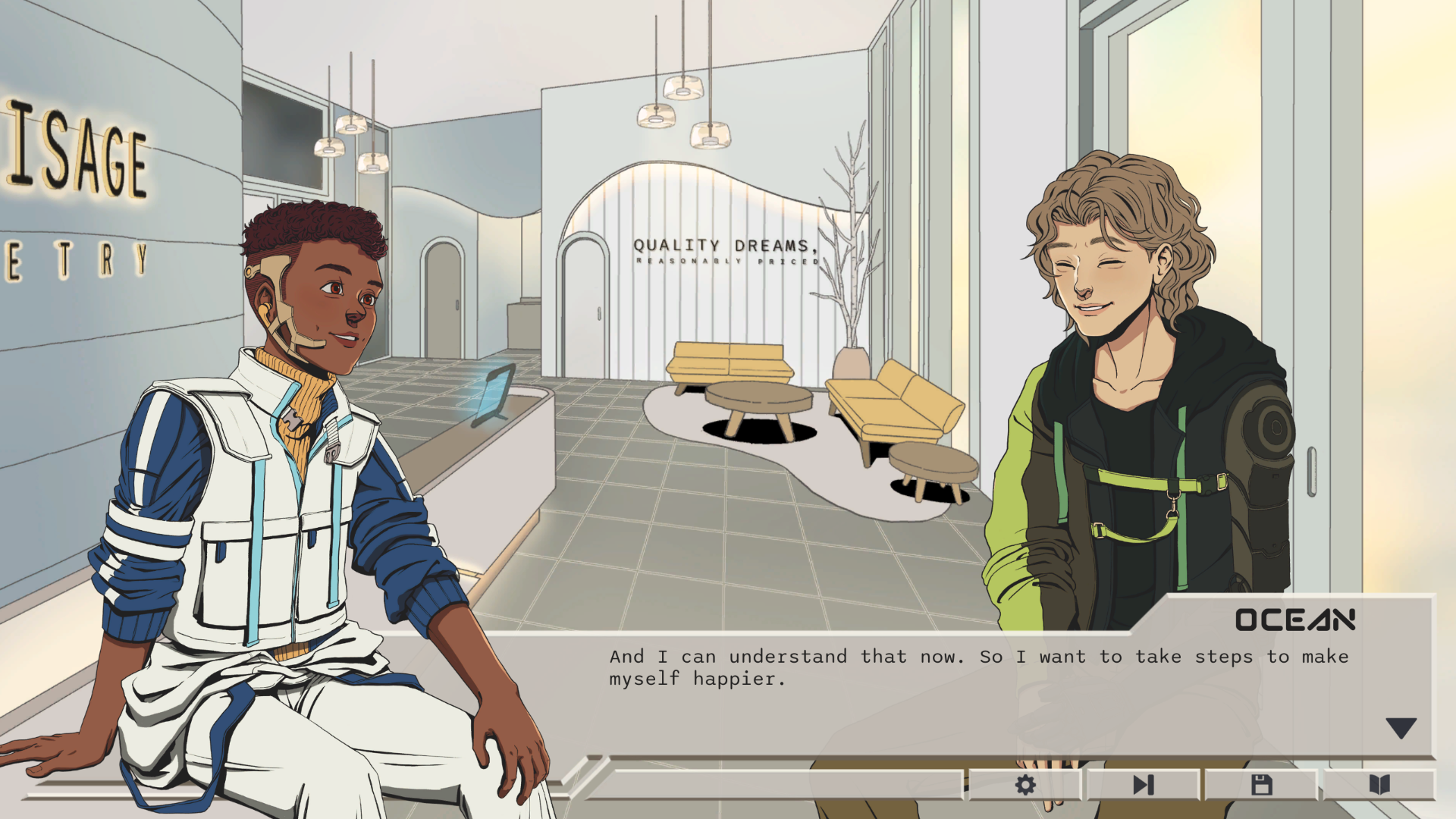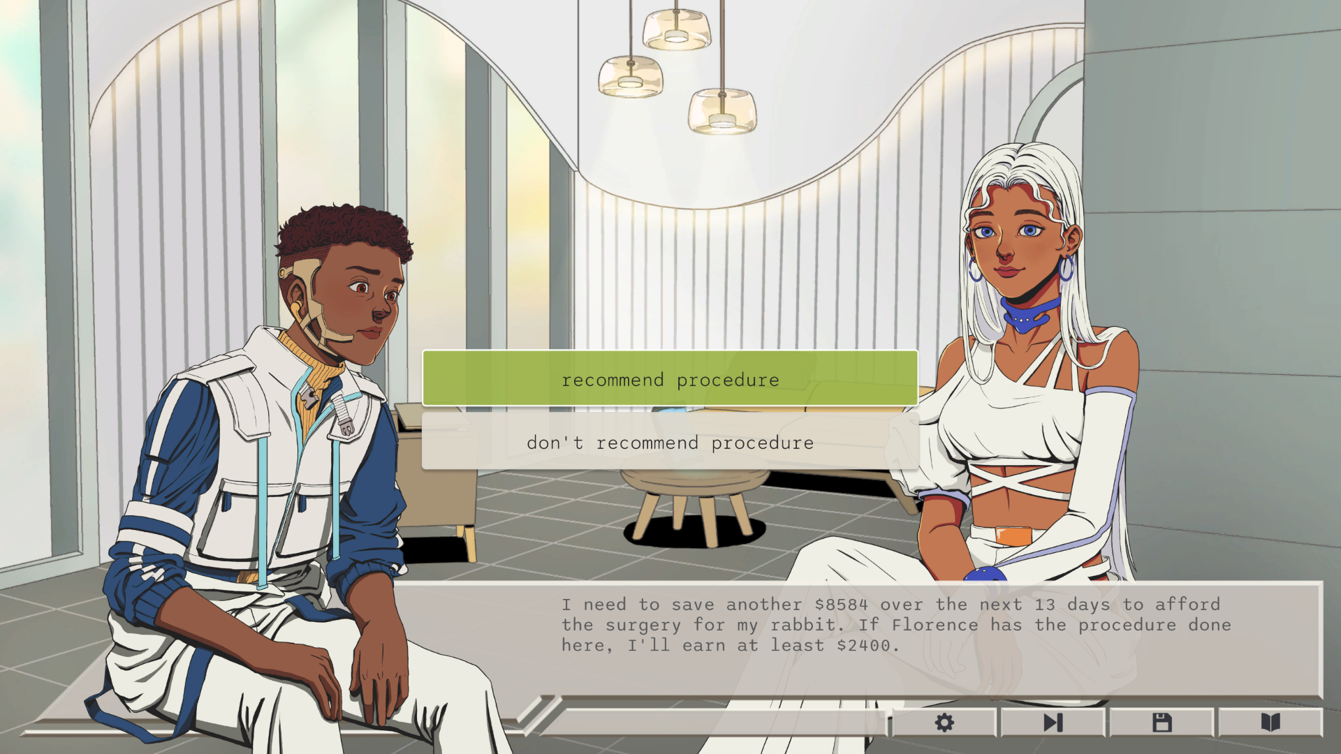 In Quality Dreams, Reasonably Priced, you work at a body modification clinic in a cyberpunk tower-city. Play as Jin, a salesperson advising clients on body mods. Making little money aside from what you earn on commission, save up enough to afford your sick rabbit's surgery in two weeks. Watch your decisions ripple through the lives of each character you meet.