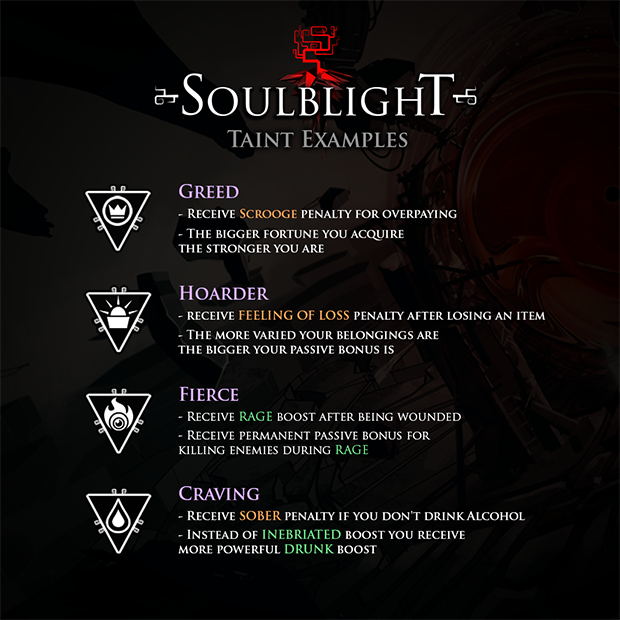 Before entering each level of the Sanctuary you get to choose a Taint that represents a certain personality trait. That choice will shape your future experiences as each Taint unlocks a new way of gaining power - a custom mechanic designed to encourage role-playing. Tainting Mechanics channels your will to survive into actions that are aligned with your hero’s personality. Let’s have a look at some examples: